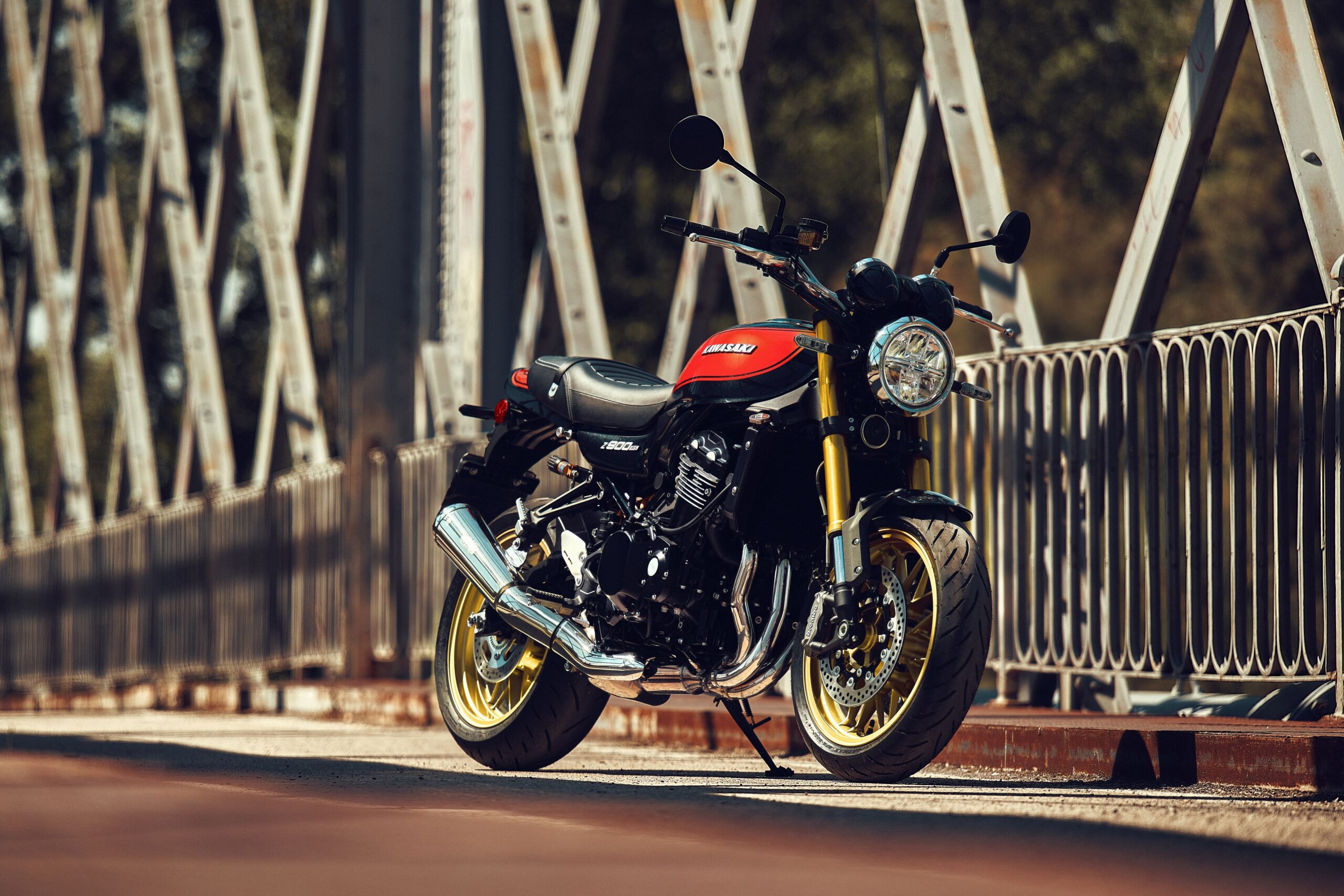 Z900RS SE leveres med Brembo-bremsepakke inkludert kalipere, 300 mm skiver og stålarmerte slanger. I tillegg får SE-utgaven en Öhlins-bakdemper med ekstern justering, for enda mer kontroll og komfort. En USB-C-kontakt er plassert ved styret, og designet er inspirert av den legendariske «Fireball», Z1-fargekombinasjonen – nå med dypere oransje grafikk og metallic svart ramme.