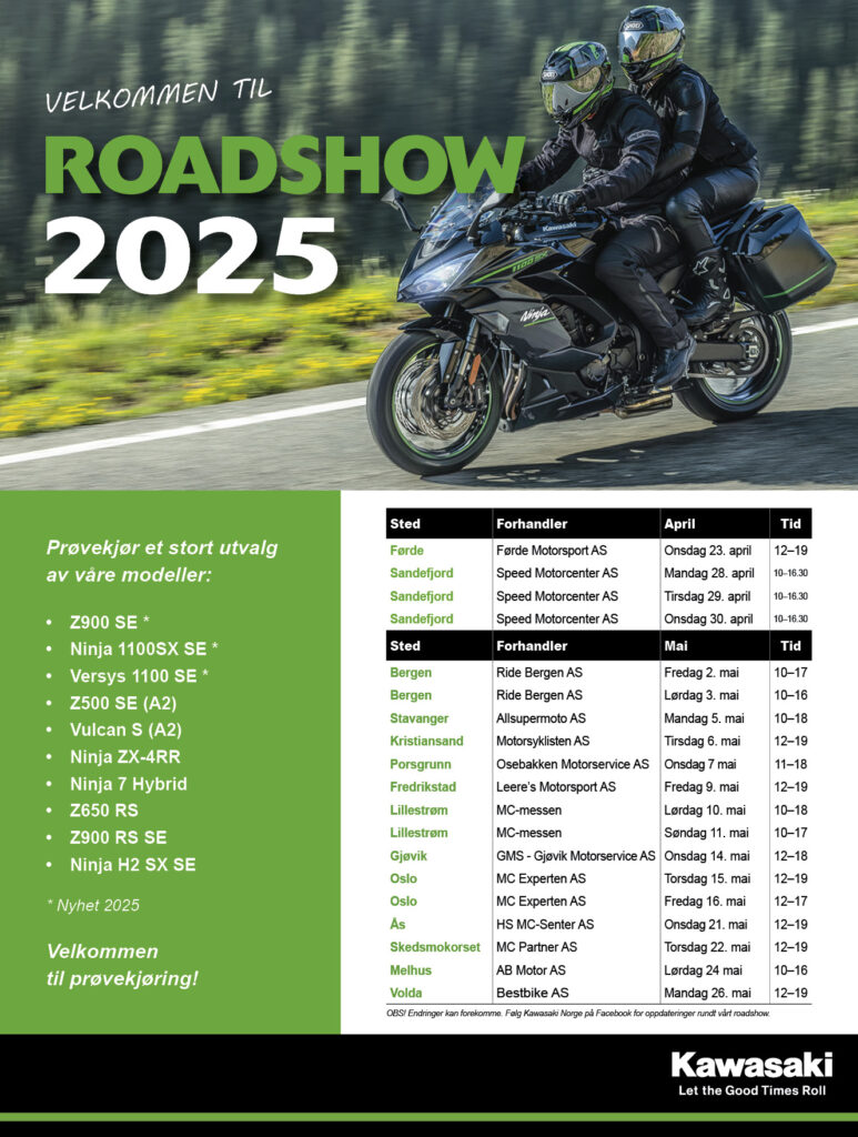 «Vi har noen fantastiske modeller på veien i år, og Roadshowet gir en unik mulighet til å oppleve dem på nært hold. Det er ingenting som slår følelsen av å prøvekjøre en Kawasaki og virkelig kjenne hva våre sykler har å by på!»