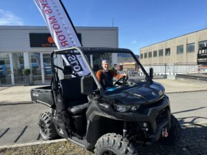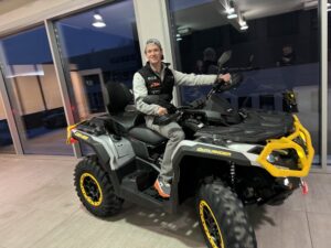 Erlend Lønnum i en Can-am ATV utenfor butikken på Rud.