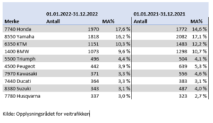 Totalt ble det registrert 9.261 lette og tunge motorsykler (unntatt 4-hjuls mc) i perioden 1. januar 2022 til 31. desember 2022. Legger vi til moped er det registrert 11.200 tohjulinger i 2022 mot 12.162 i samme periode i 2021, som sammen med 2020 var rekordgode salgsår for mc.