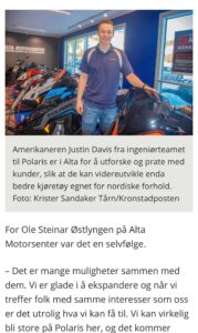 – Vi synes det er utrolig tøft at dem er med på å satse. Bare det at vi har fått Polaris i hus er ekstremt bra, også er det utrolig gøy at toppene i Polaris kommer hit og vil noe i Alta. Det er også kult at Justin er her for å teste scootere, snakke med kunder og sjekke markedet, forteller han.