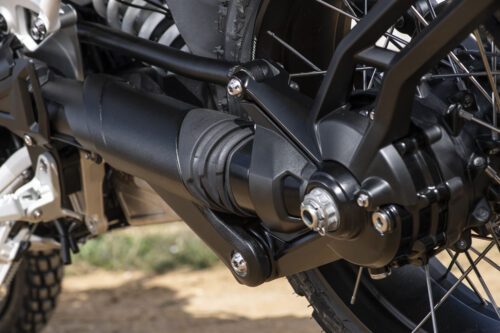Den nye Tigeren har, som den gamle, kardangdrift. Dette var et krav til utviklingsingeniørene, som ellers fikk ganske frie tøyler da de startet på prosjektet. Det nye er imidlertid at Triumph nå presenterer en kardangløsning med dobbelt baksving. Dette er en langt mer vridningsstabil konstruksjon som tillater at man har spart 1,5 kilo med uavfjæret vekt. Kardangen blir visuelt og reelt mer smidig og mindre dominerende, og det hele fungerer helt utmerket. Triumph kaller svingarmen Tri-Link etter trekant-innfestingen på høyre side. Ved demontering av bakhjul løsner man navbolten og de to fremre boltene i trekanten, og kan dermed ta hjulet ut til siden.