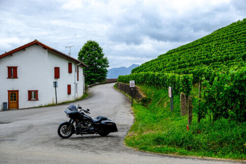 Om ettermiddagen ble jeg lovet sol, noe som hjalp betraktelig på humøret. Snart var jeg ute på veien igjen i mine egne tanker, da en Dyna passerte meg og vekket meg igjen med et brøl. Det var tydelig at denne karen kjente veiene godt og jeg bestemte meg for å prøve og holde følge. Oppkvikket over min nyvunne konkurranseånd, endte vi opp med et race for to, noe som tok meg langt raskere gjennom svingene enn jeg ellers hadde våget alene. Jeg tror vi begge fikk noe ut av det, for da han tok av veien mot en lokal gård fikk jeg et vink og et vennlig nikk til avskjed. Jeg fortsatte litt videre før jeg satte til livs noen flere pintxos, og krysset grensen tilbake til Frankrike.