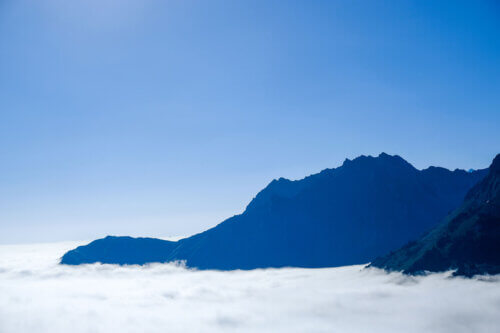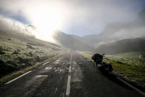 Neste morgen var tåkete og grå, nesten som om skyene hadde falt ned fra himmelen og landet midt i landsbyen. Jeg bestemte meg for å pakke teltet og ta fatt på turen opp Col du Tourmalet som tar deg med helt opp til 2.115 meter over havet. Mer enn høyt nok til å kanskje komme over skylaget igjen og få sett et fenomen som kalles Mer de Nuages, et hav av skyer.g Jeg følte meg veldig optimistisk. Med fullt regnutstyr satte jeg av gårde langs veien som slynget seg oppover fjellsiden. Klokken var bare syv om morgenen og jeg hadde hele veien stort sett for meg selv. Etter omtrent 20 minutter begynte lyset rundt meg å bli skimrende gult og oransje, og jeg visste at det bare var et tidsspørsmål før jeg ville passere gjennom skylaget. Den gule, magiske tåken og følelsen av å klatre opp gjennom skyene var helt fantastisk. For hver meter ble lyset bare skarpere og lysere, og plutselig var jeg der: på toppen, over skyene, bare blå himmel over meg og fjelltopper på alle sider, fortsatt kledd med kritthvite snøtopper. Jeg sto ved siden av sykkelen og sugde inn alle inntrykkene, overveldet av skjønnheten rundt meg.