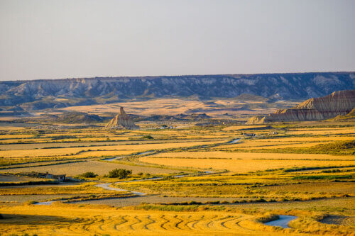 Den stekende sola gjorde seg stadig mer gjeldende i det jeg forlot fjellmassivet og kjørte inn over den spanske landsbygda med kurs for ørkenen i Bardenas-Reales. Det føltes deilig å koble hjernen helt ut og bare legge mil etter mil bak seg uten at det krevde særlig innsats. Jeg kom frem til Tudela i den tyngende ettermiddagsheten, og booket meg et hotellrom for en kjærkommen sjanse til å vaske av meg støv og svette. Så var planen å dra rett ut i nasjonalparken for å oppleve en ekte solnedgang i ørkenen på nært hold. Dusjen fikk liv i meg etter drøye 10 timer på hjul, og snart var jeg klar igjen for kveldens tur.