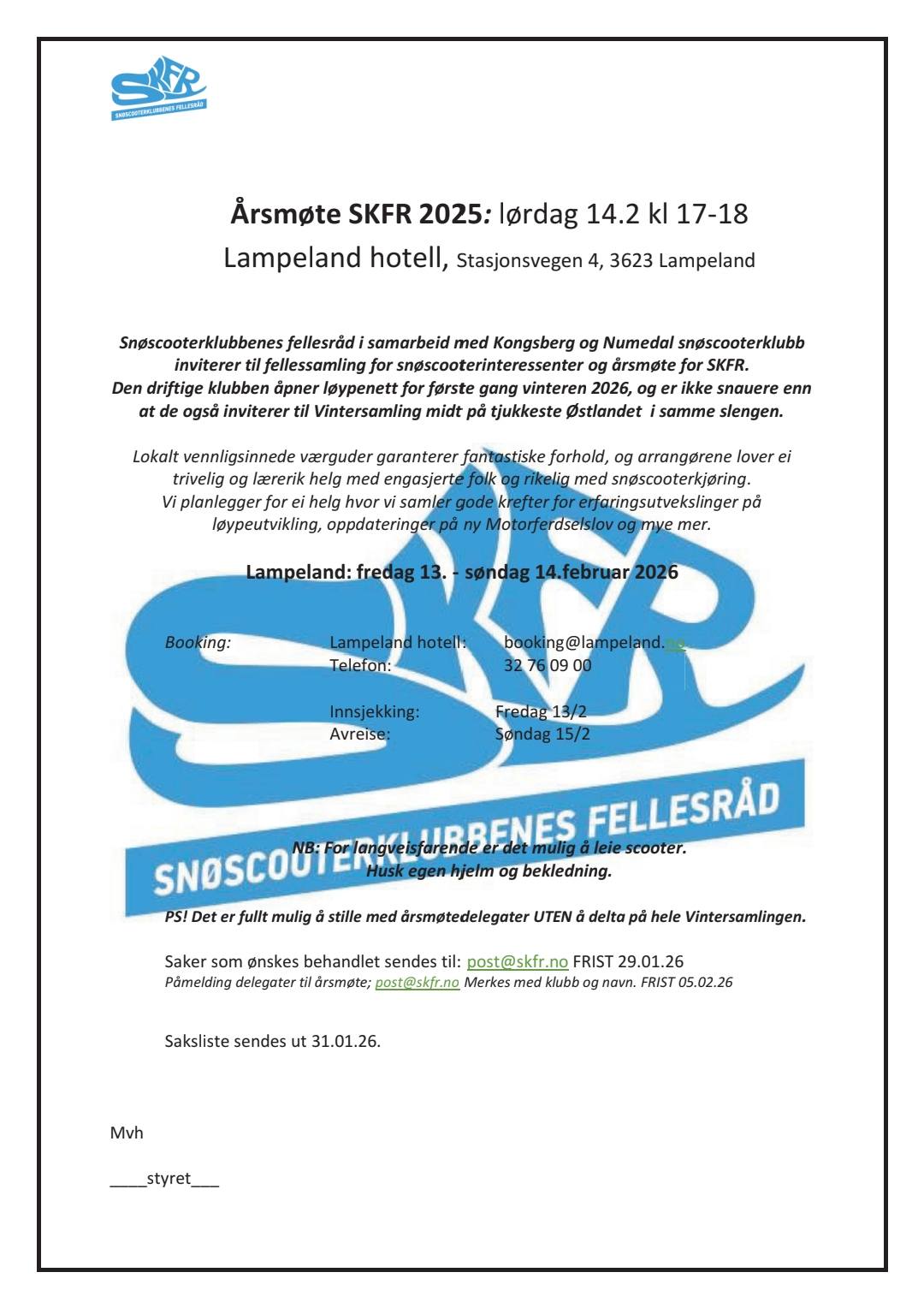 For mer informasjon: post@skfr.no og Snøscooterklubbenes Fellesråd.