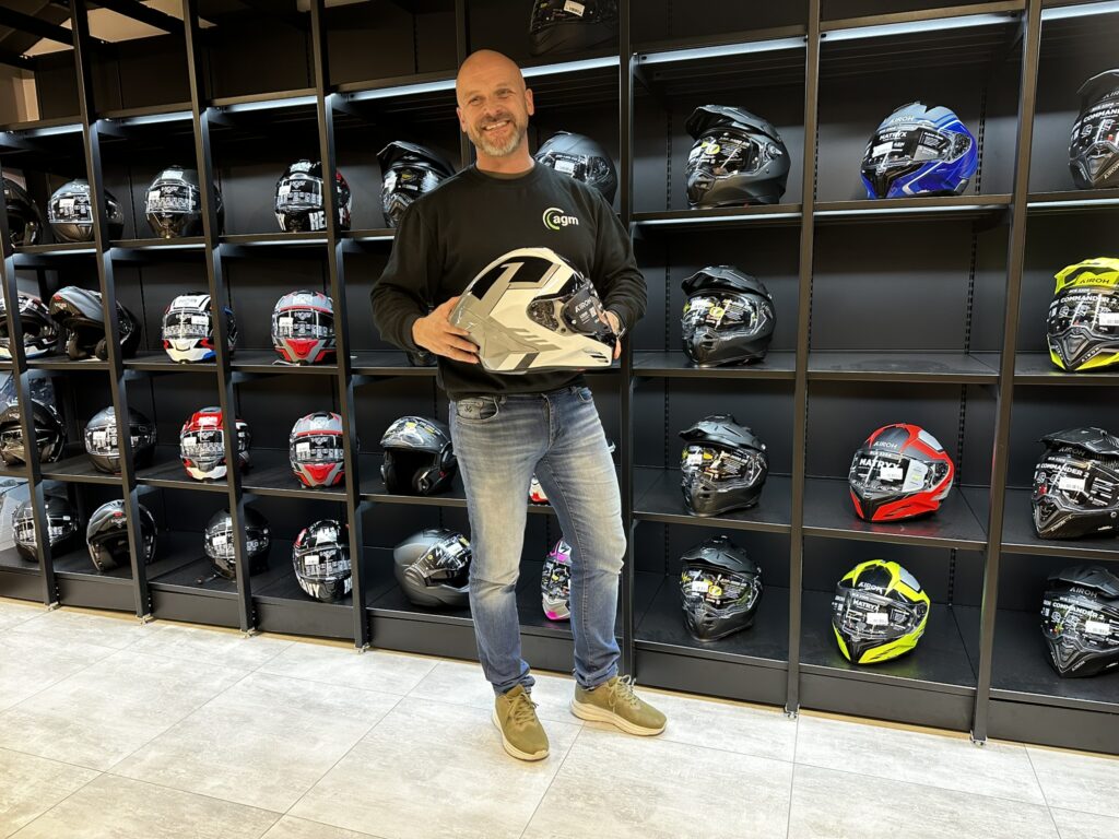 Det står store stabler på gulvet med hjelmer og hyllene er gjort klar med massevis av hjelmer. Her blir vi presentert for både NOS og Airoh. NOS hjelmen er relativt nye og ble lansert under messehelgen hos AGM i Sarpsborg. NOS hjelmer er kjent for sitt innovative design og høye kvalitetsstandard, men til en overraskende hyggelig pris.