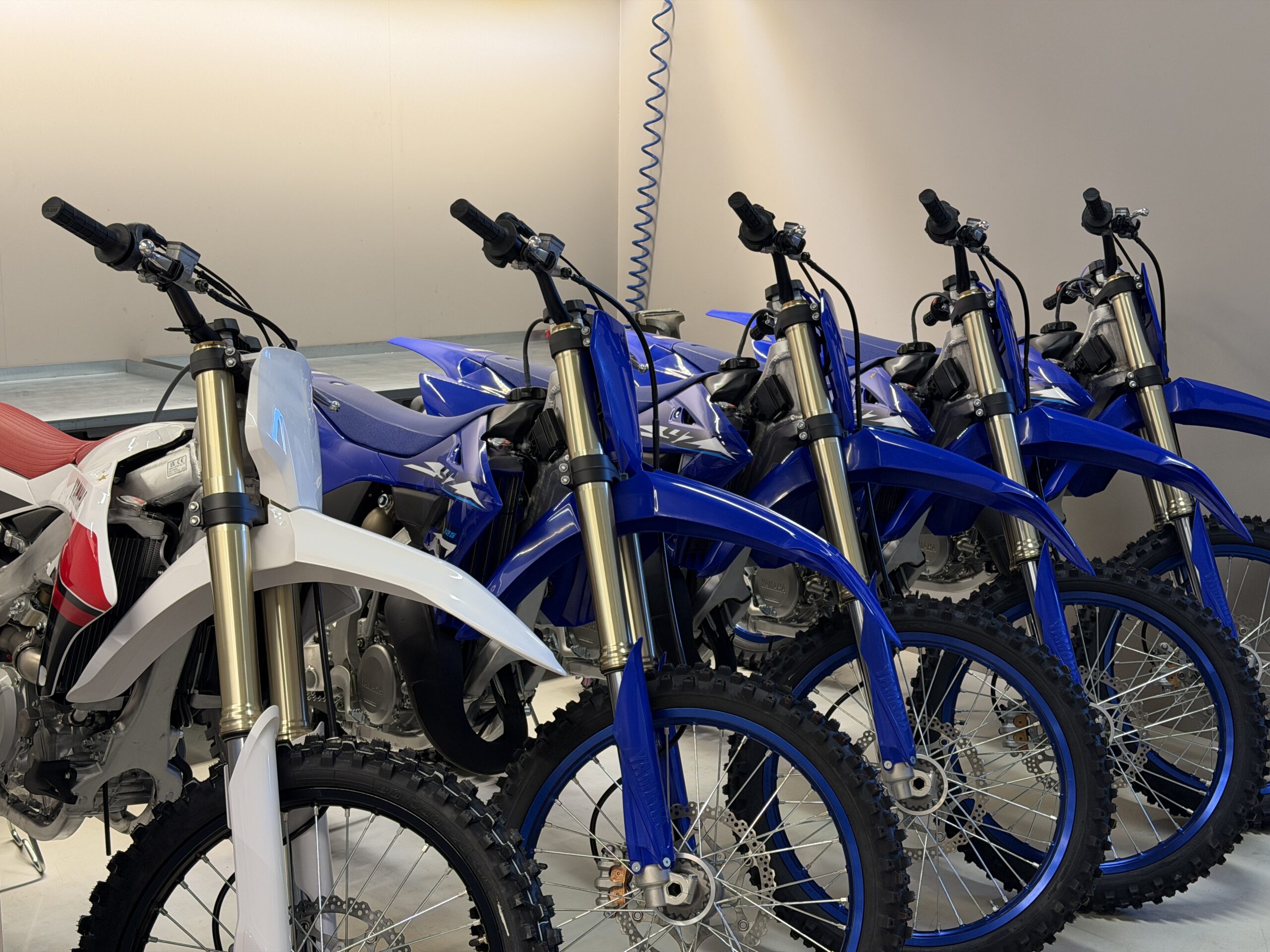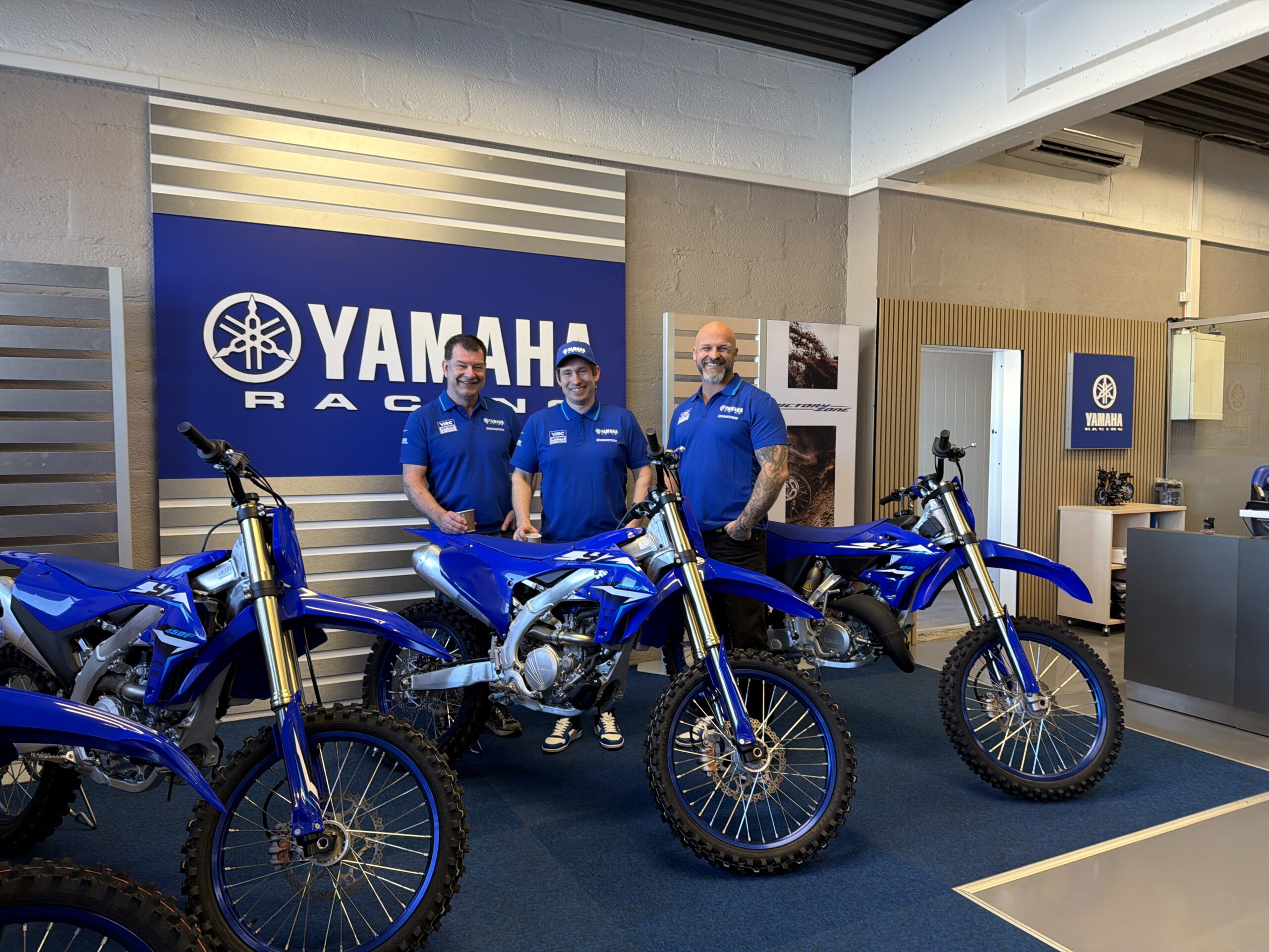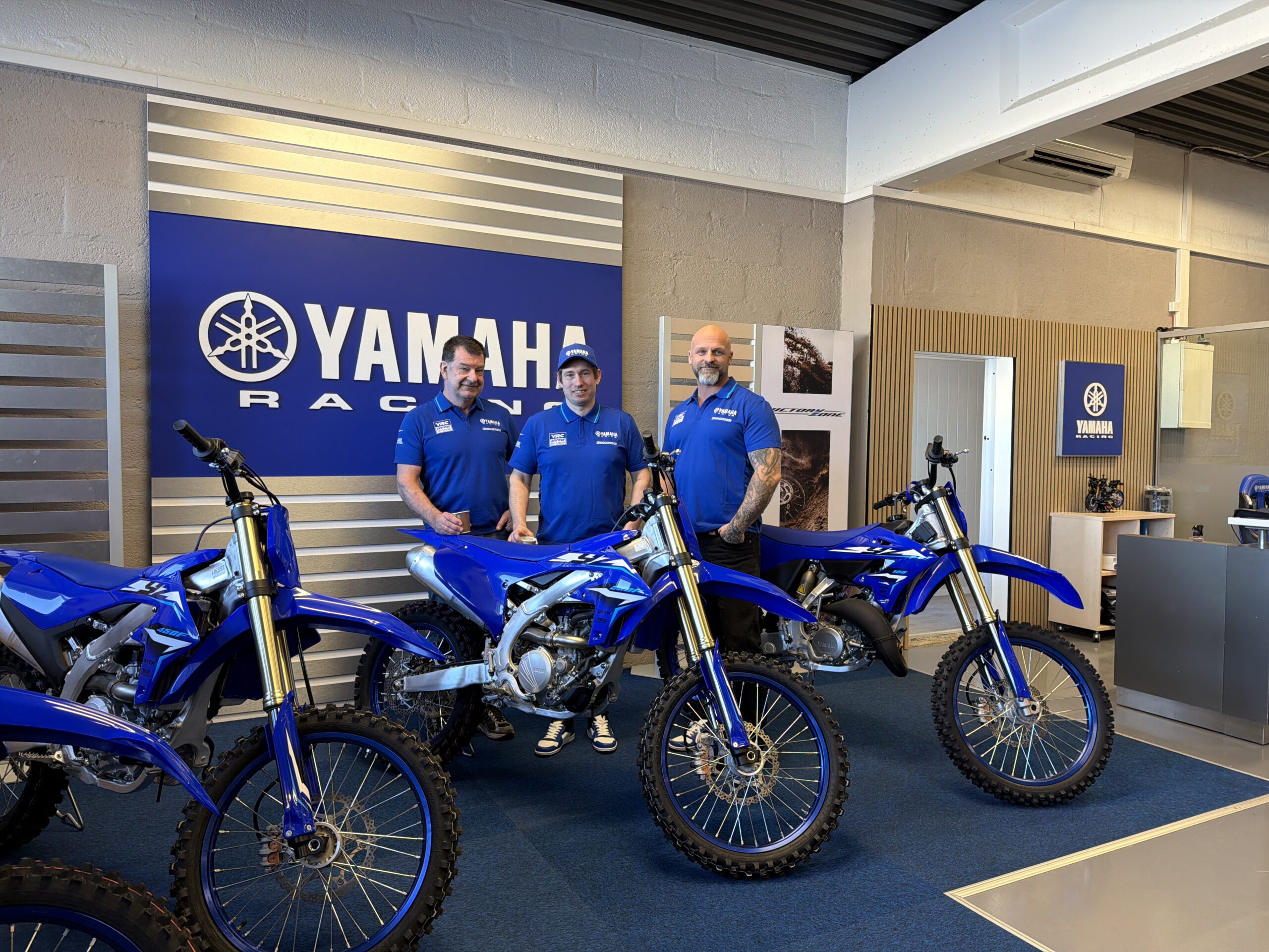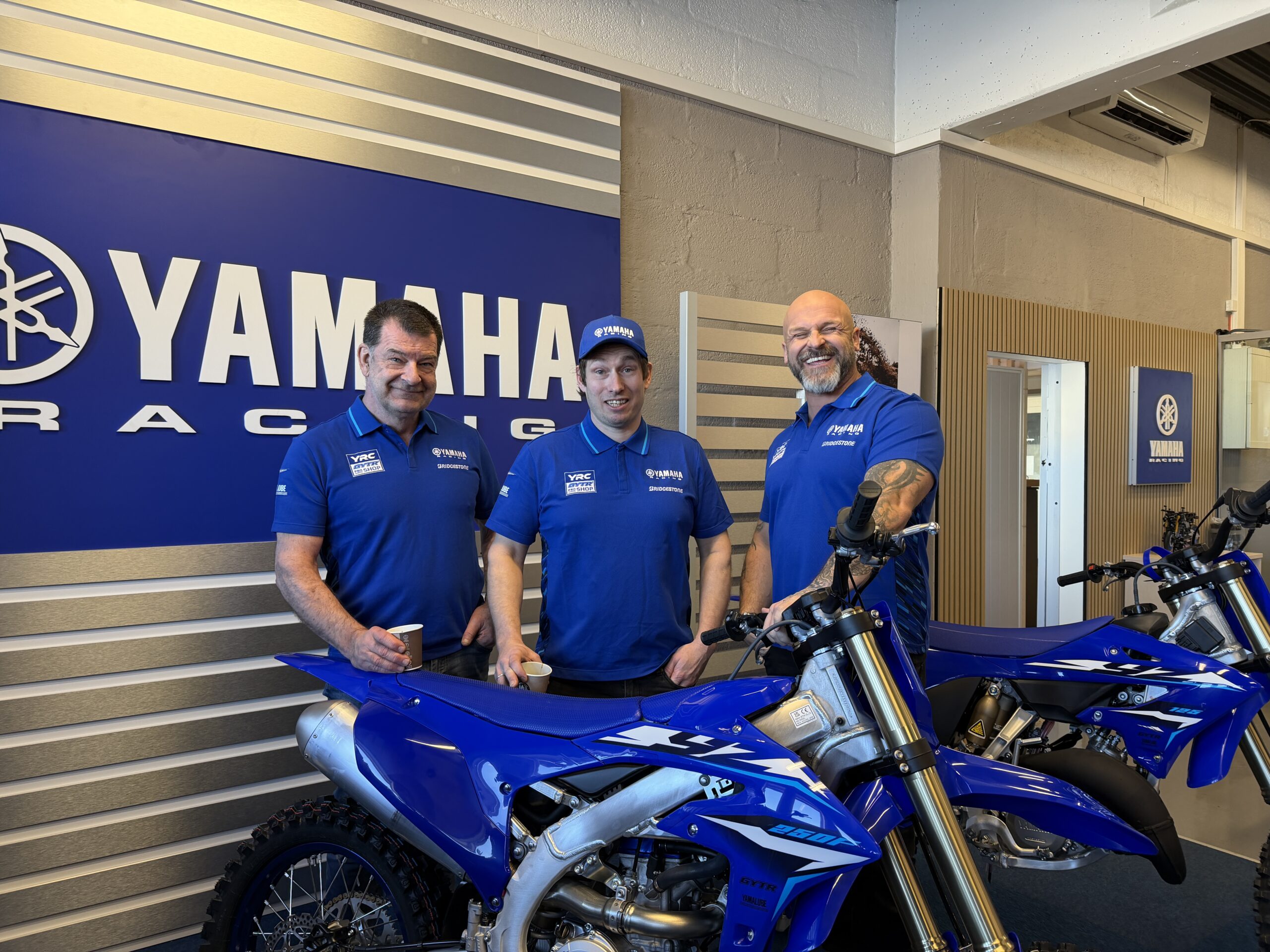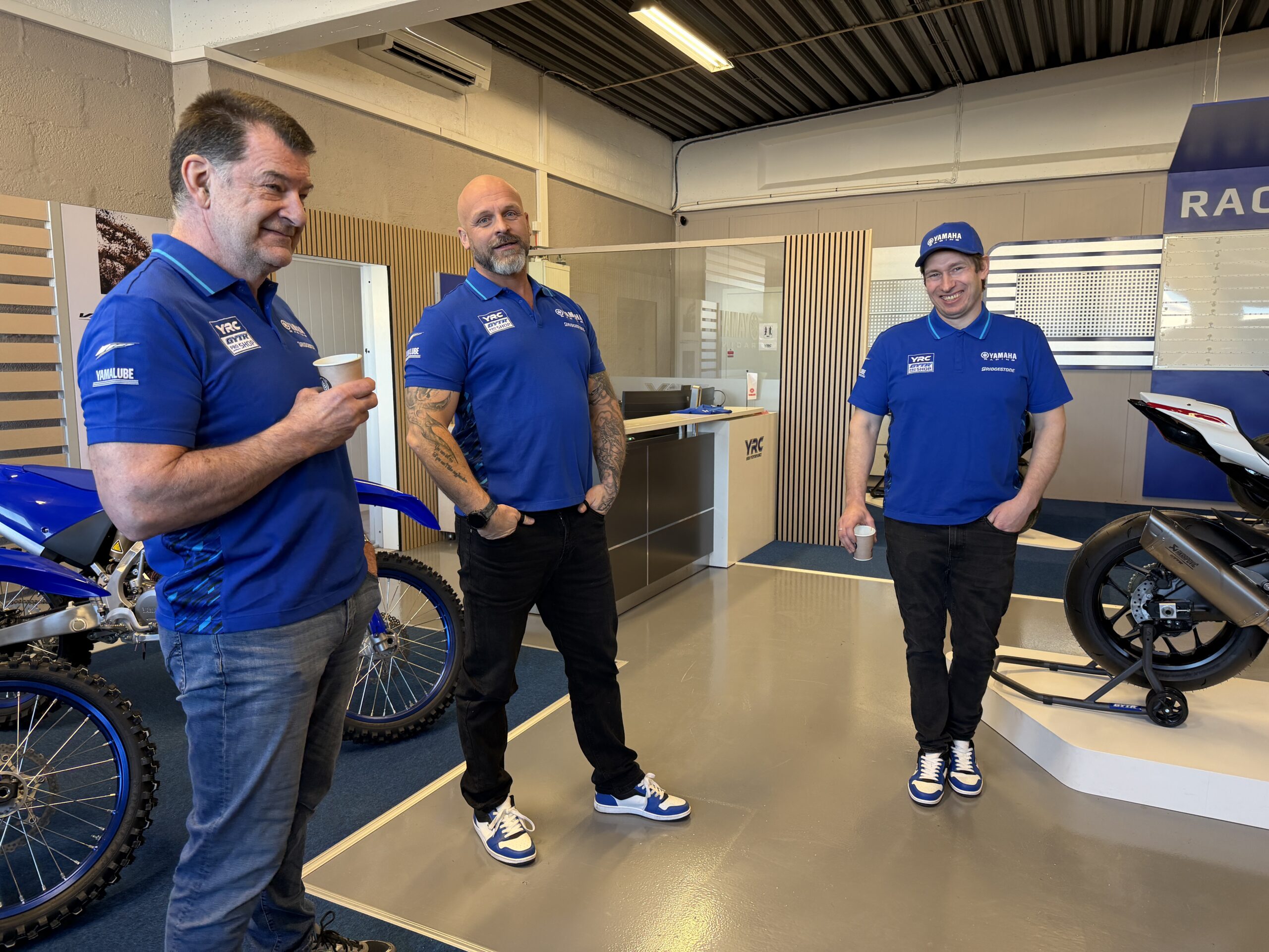 Det tok ikke lang tid før vi fikk selskap av ytterligere en legende fra roadracing verdenen, Geir Hestmann, som har kommet inn i firmaet fra januar 2026. Og etter hvert dukket også tredjemann på laget, Stein Ove Salvesen opp og Kjetil fortalte at teamet også består av ytterligere en mekaniker. Da vi spurte hvor mange mestertitler de hadde samlet under samme tak, nevnte Kjetil at også ektefellen jobbet deltid med regnskap i firmaet, og at dersom de også regnet med hennes titler rundet de anslagsvis 50 stykker. Det var åpenbart svært mye kompetanse og erfaring samlet i det stilige lokalet. Kjetil opplyste at de har forhandlet Yamaha i flere år, både til gate og konkurranse, men ser i større grad på seg selv som et verksted som selger motorsykler, enn en forhandler som har et verksted.